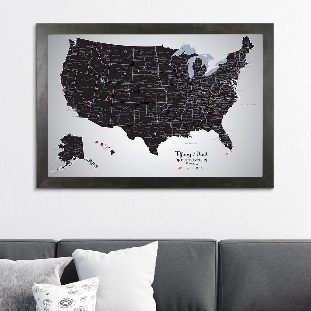 Black Ice US Map | Black and White Canvas USA Map Push Pin